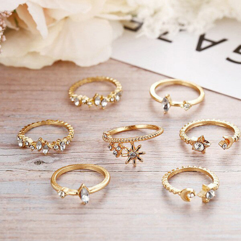 Gold Plated Moon–Star Stackable Ring Set (Set of 7)